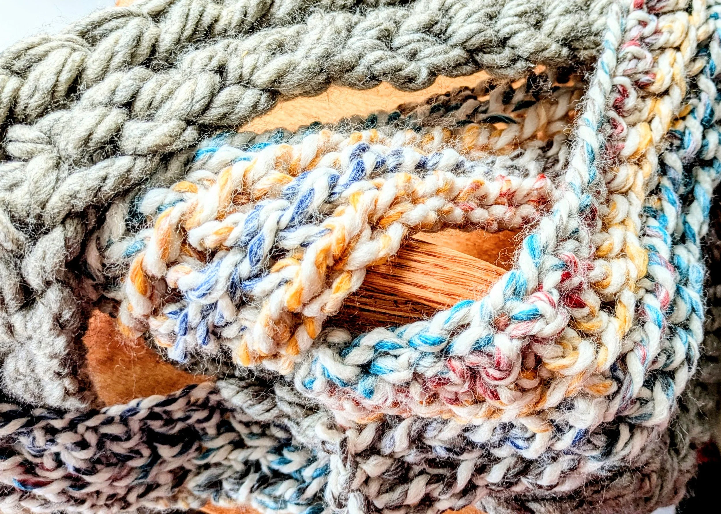 Last night, I taught myself to finger crochet. I didn’t feel like creating a knotted tapestry, I wasn’t in the mood for the crochet hook, and I wanted to do something with my hands. Out came the bulky yarn I had left over from mindful knotting projects earlier this year, and the grand experiment began! I looped and pulled and unwound, looped, pulled, unwound, and finally looped, pulled, and kept going. Slowly but surely, a thick rope emerged, and slowly but surely, the yarn ran out. Then I grabbed more yarn and tried again, figuring out stitches as I went along.